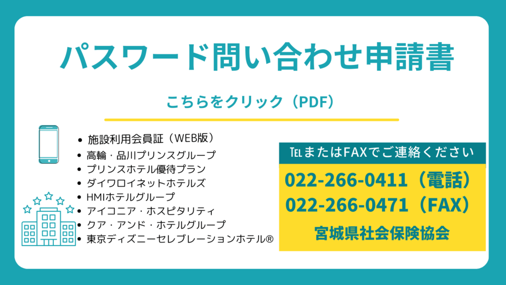 一般社団法人全国社会保険協会連合会と一般財団法人宮城県社会保険協会が社会保険協会の会員事業所の皆様の福利増進を目的に利用時に提示するだけで、ホテル等の優待施設を割引優待料金で利用できる「施設利用会員証(紙カード・WEB版)」を発行しております。